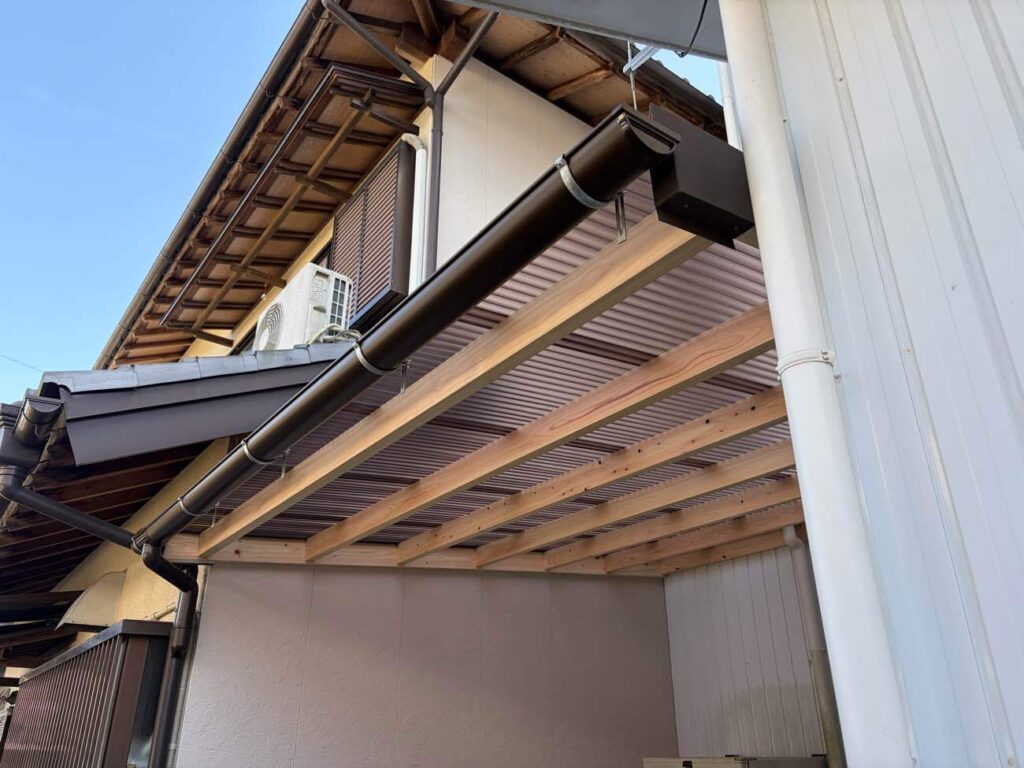 - 建物同士の狭小スペースにおいて、異なる外壁材の取り合い・既存設備との干渉に配慮しながら、防水性と動線改善を両立したテラス屋根施工。テラス屋根設置により雨の吹き込み軽減や、出入り・生活動線の改善ができました。